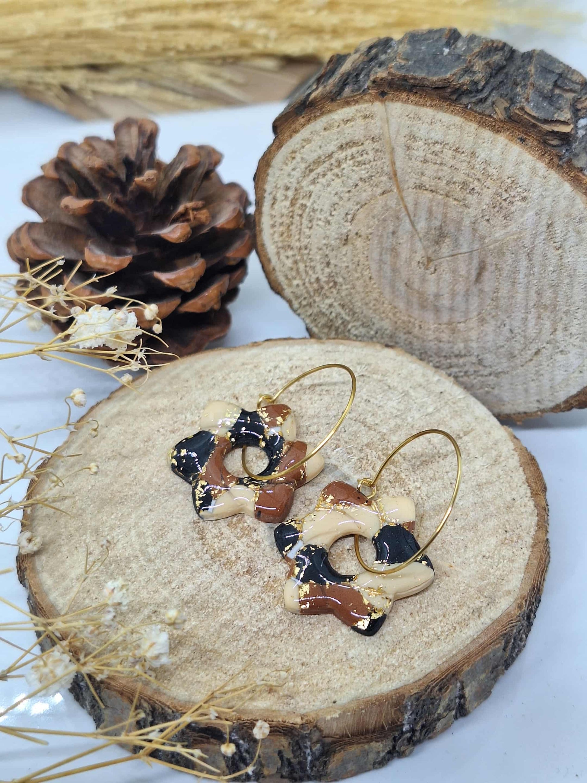 Paire de créole interchangeable Louise. Marron, beige, noir et blanc.