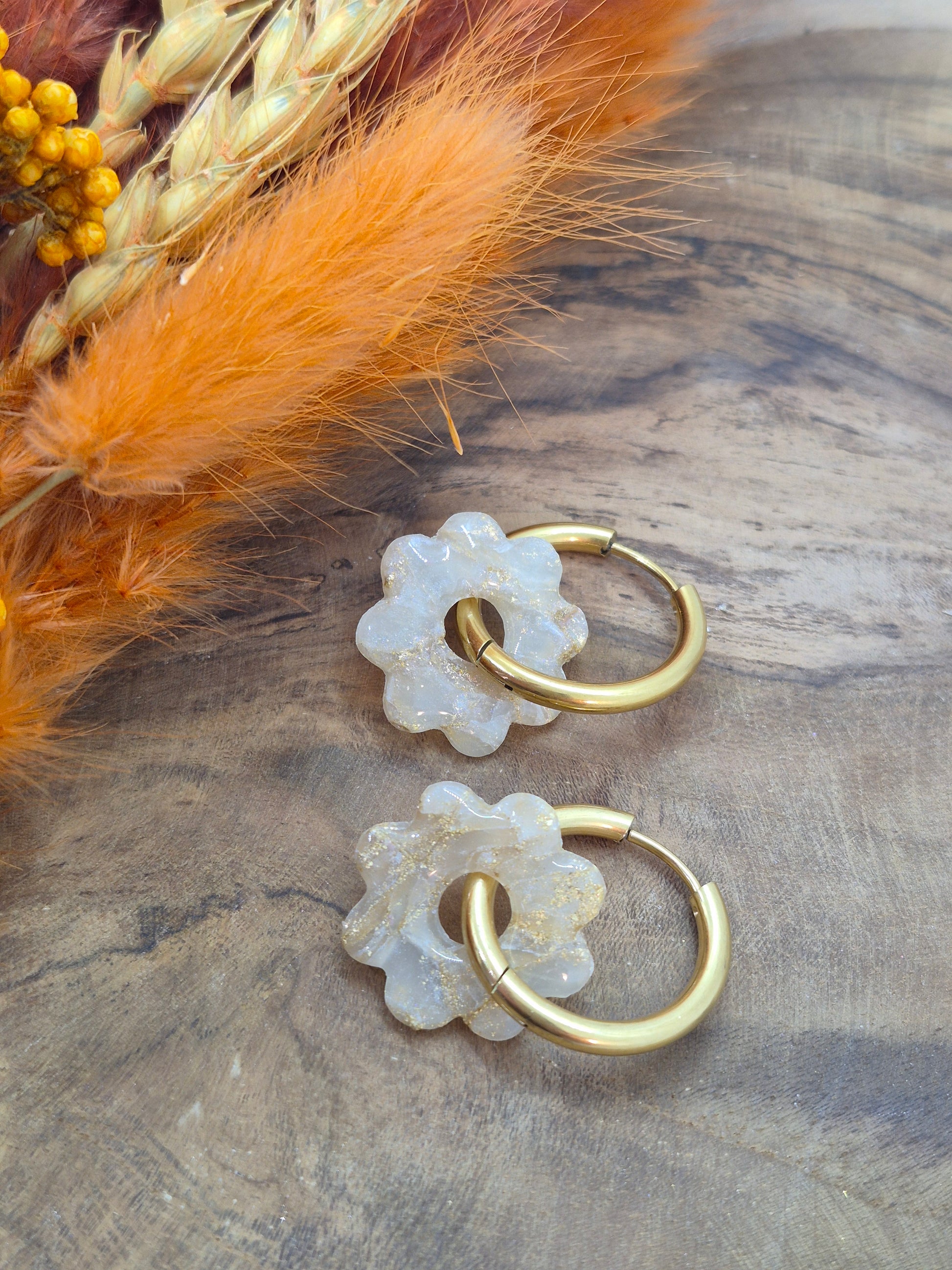 Délicate et lumineuse, la pampille LOU se distingue par sa forme fleur subtilement irrégulière et ses reflets nacrés parsemés de fines paillettes dorées.