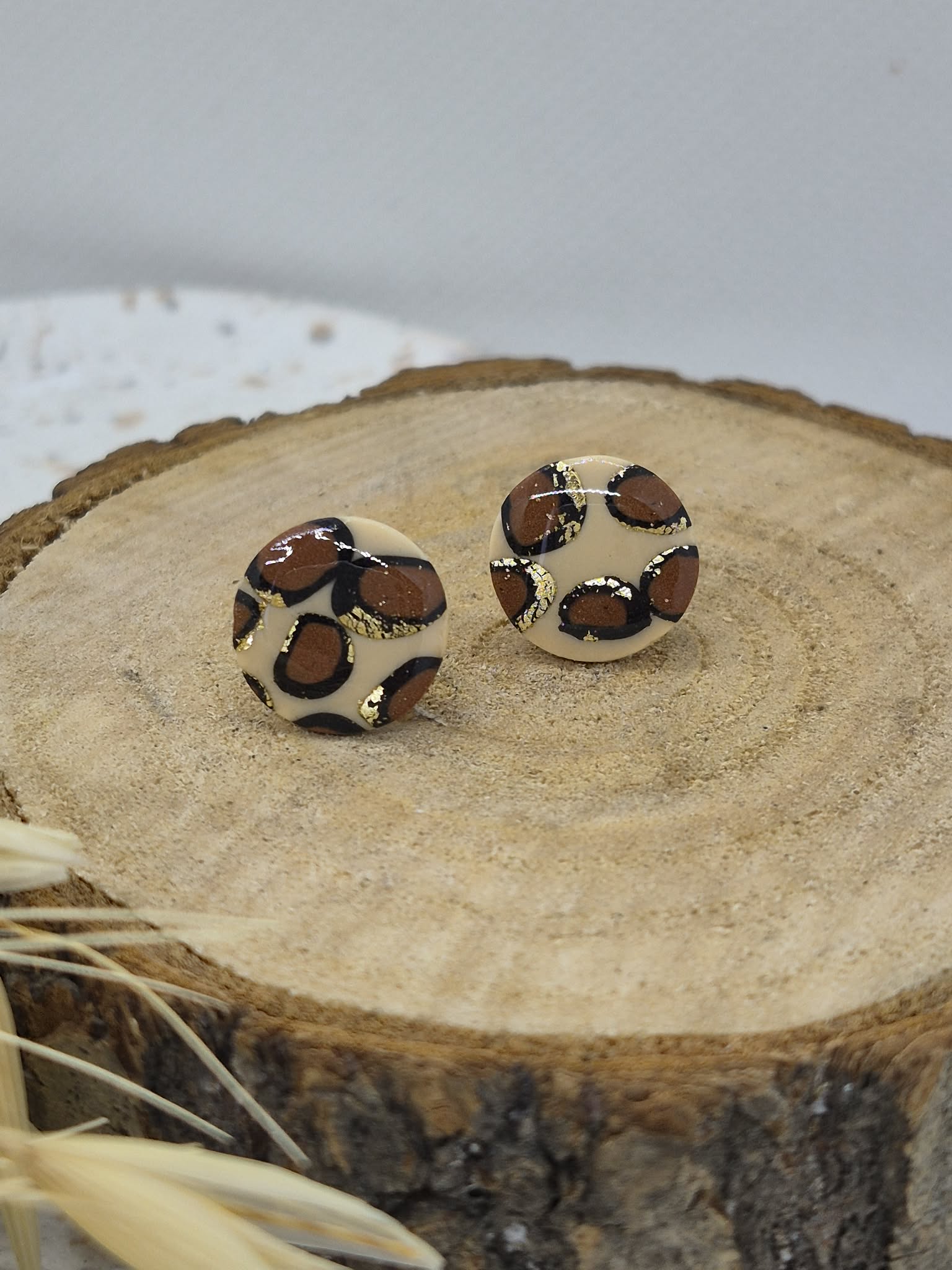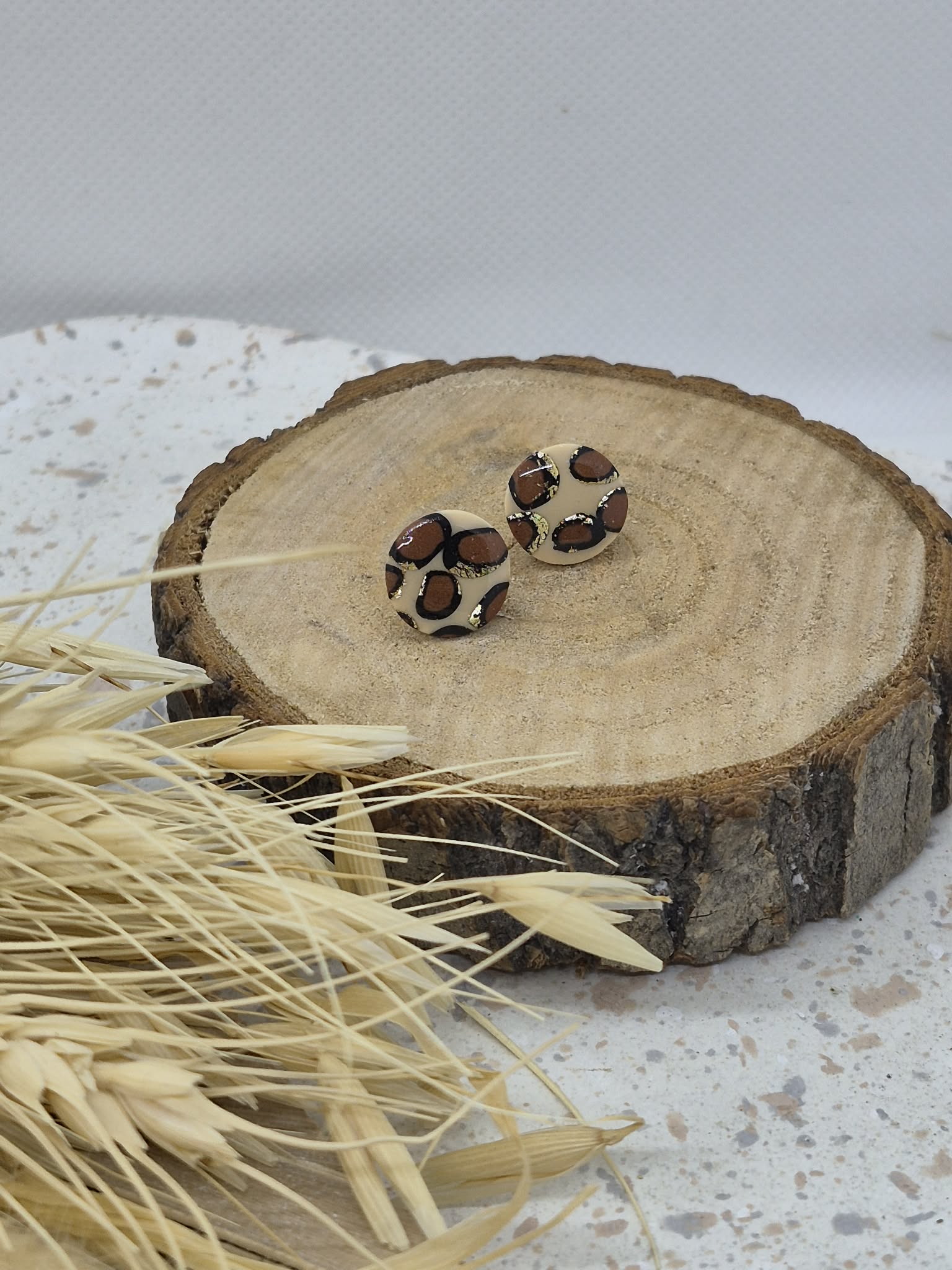 Mignonne paire de puce de forme ronde avec le motif Léopard. Cette paire donnera à votre tenue cette touche de d'originalité, d'élégance avec son côté sauvage. Chaque pièce est réalisée à la main et à l’issue de plusieurs mélanges de couleurs, de techniques.