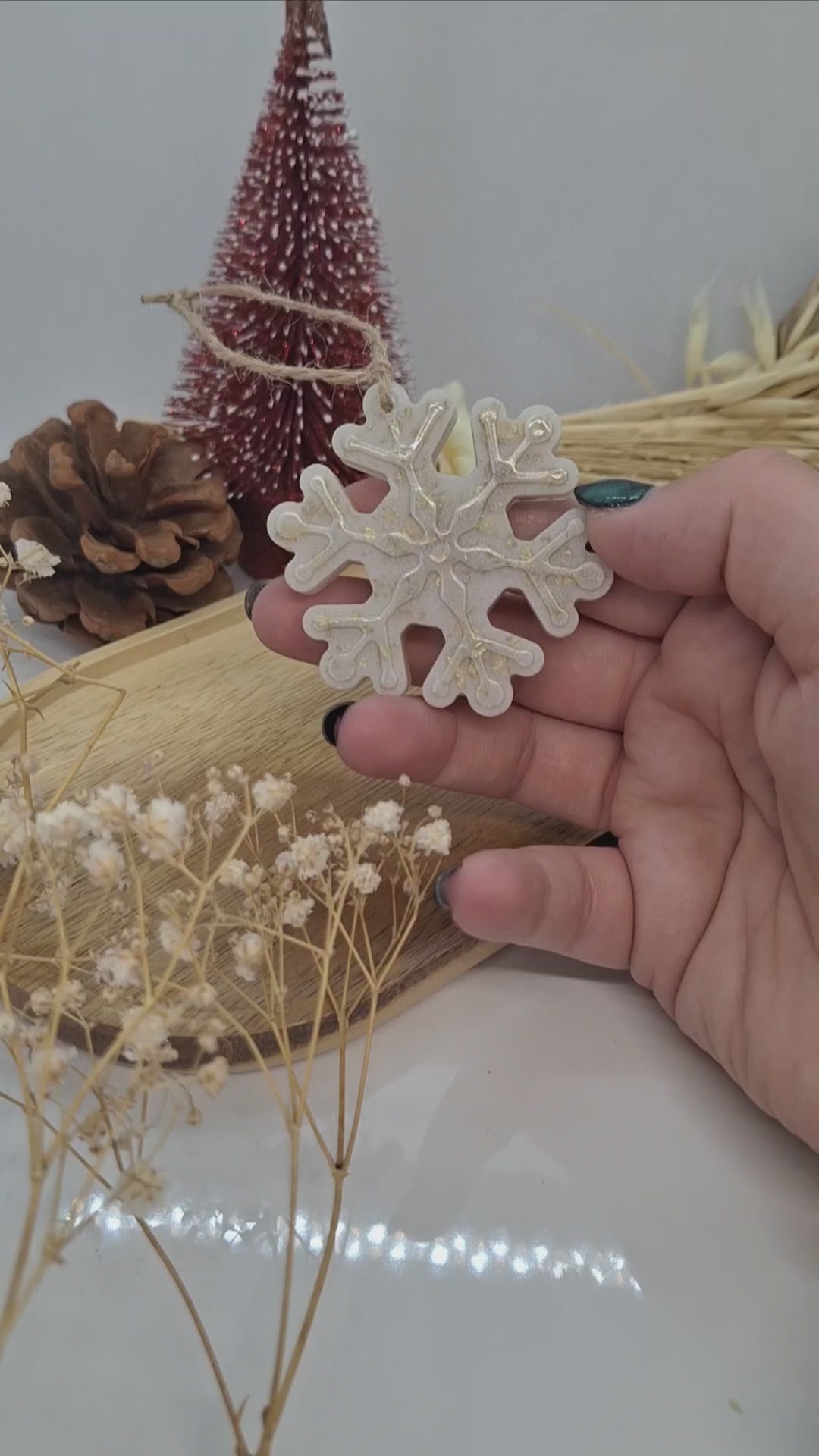 Suspension de noël réalisée en résine avec feuille dorée et peinture blanc nacré.